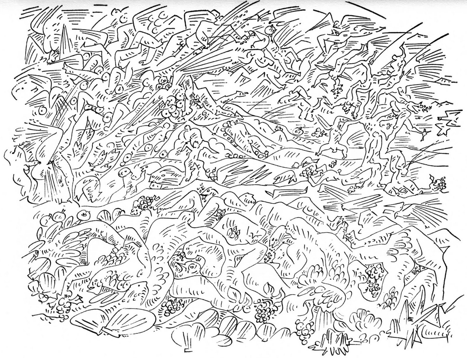 Die Zeichnungen selbst sind äußerst dynamische, teils abstrakte, teils figürliche Darstellungen der Geschlechter (hier ein Beispiel einer Zeichnung) innerhalb einer Welt voller mythologischer Bezüge – von der rasant hingezogenen Linie und Schraffur über phantastische, roboterartige Figuren, Flügelwesen und Bäumen bis hin zu Eiswüsten und Sintfluten tobt sich der „automatische Zeichenstift“ hier aus. Als 1961 die Zeichnungen in einem Buch veröffentlicht wurden, schrieb Jean-Paul Sartre das Vorwort und charakterisierte Masson in einem zutiefst humanistischen Kontext.